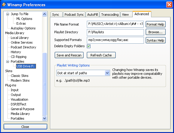 In Winamp's Media Library pane on the left, right-click on "USB Drive F:" and click Properties. Click on the Advanced tab of the window that appears.